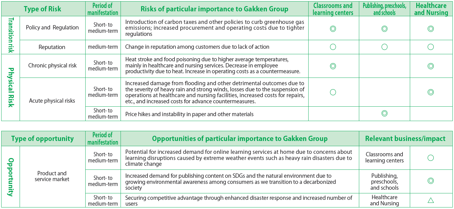 Moreover, our group's operational landscape has been categorize d into distinct sectors: the "Education Sector" and the "Health care and Nursing Sector." Within the "Education Sector," we have further delineated it into the "Classroom and Learning Center" as well as the "Publication Content and Merchandising Business for Kindergartens and Schools." In this meticulous examination, we have diligently scrutinized the potential impacts of climate change on each of these distinct areas.