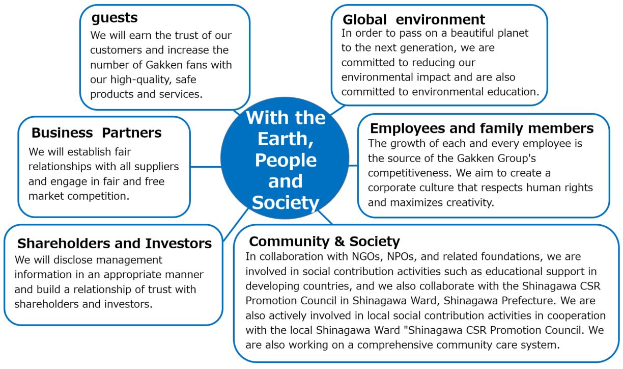 The Gakken Group promotes its business in collaboration with employees, customers, shareholders, investors, suppliers, local communities, and government agencies to realize its philosophy and create social value.