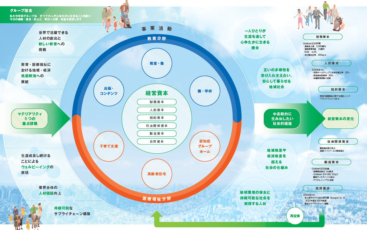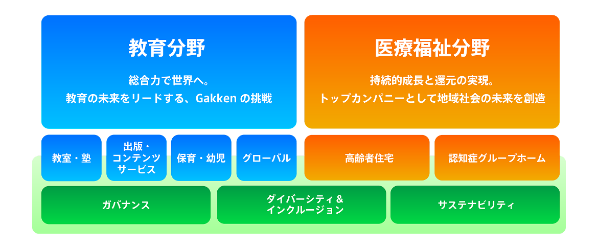 祖業である教育・出版事業から、社会課題解決に貢献するという創業の志はしっかりとグループに受け継がれ、現在は教育分野だけでなく医療福祉分野へと、幅広い事業を展開しています。