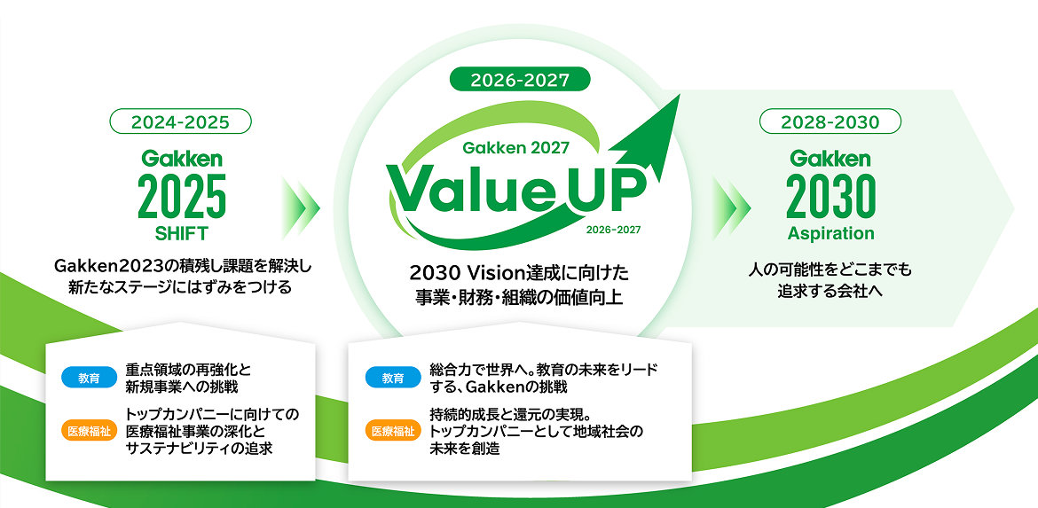 2025年11月に発表した新中期経営計画「Gakken2027」では「Value UP」をテーマに掲げ、2027年、さらには2030年に向けて「人の可能性をどこまでも追及する会社へ」を目指し、挑戦し続けてまいります。