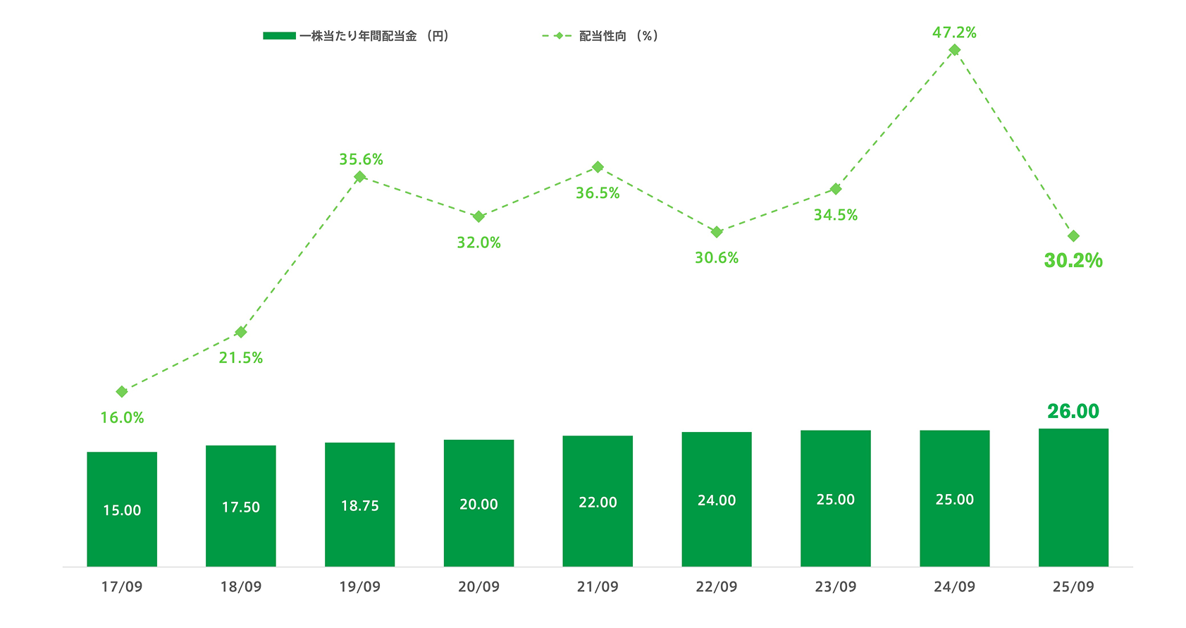 株主還元については配当性向30%以上を維持し、累進的配当、すなわち「減配せず、配当維持もしくは増配」する方針です。