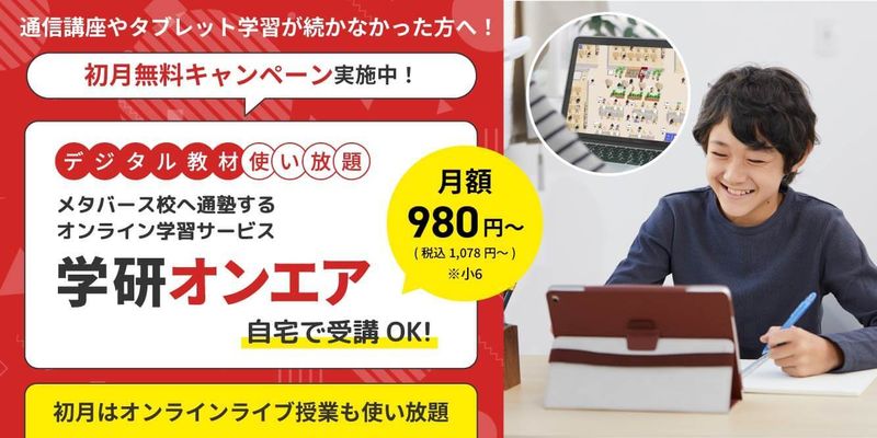 学研メソッドより提供しているオンライン学習サービス「Gakken ON AIR」が、メタバース(仮想空間)を取り入れたサービスに4月からリニューアル開校。 ライトプランは、5教科セットで中学生の受講料は月額980円~(全部で3プラン)。初月無料キャンペーンでは、一番上のプレミアムプランが体験できる。対象は小学6年生~中学生。 メタバースでやる気が続く、新しい学びを、是非体験してください。