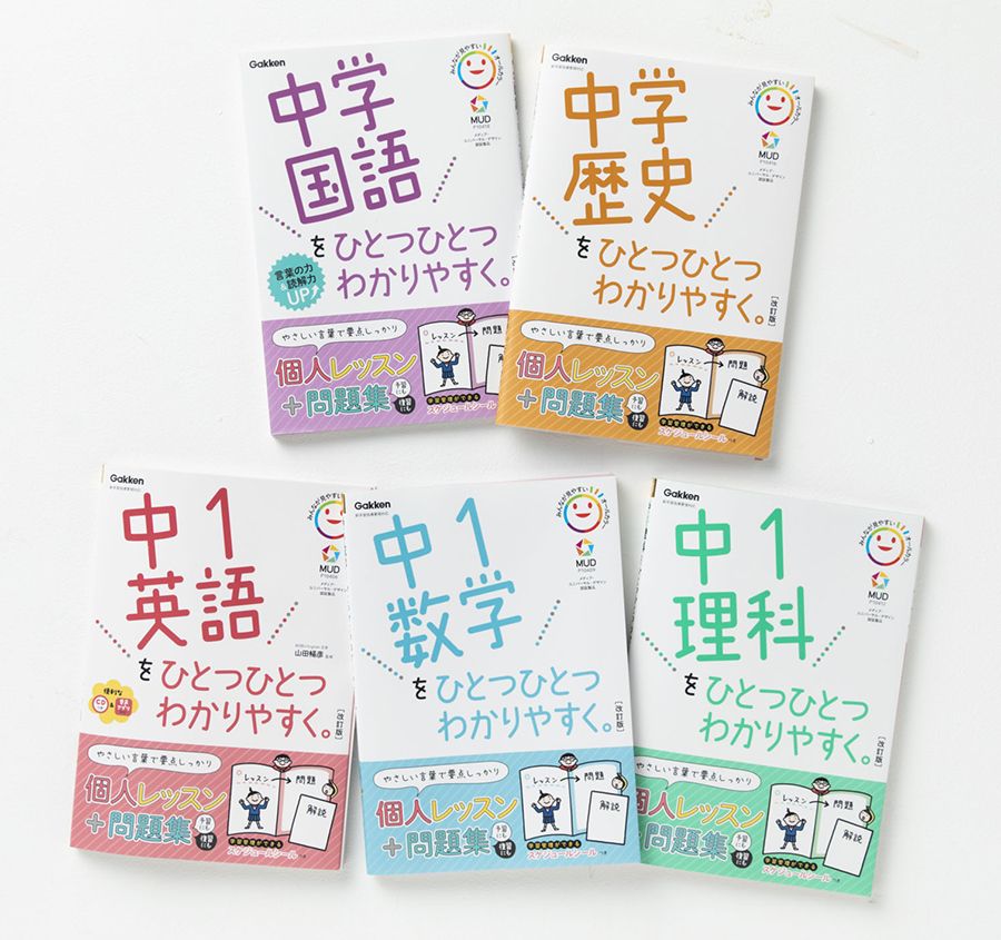 2021年春、学研プラスは『ひとつひとつわかりやすく』シリーズの中学生向けのラインアップ13点をリニューアルしました。 全ページをカラー化し、参考書としては初のメディア・ユニバーサルデザイン認証も取得。区別しやすい色づかいと、矢印の形などのデザインに配慮することで、どんな方でも直感的に理解しやすい解説になりました。シリーズ前年比は163%と伸長し、類書シェア№1に躍り出ました。