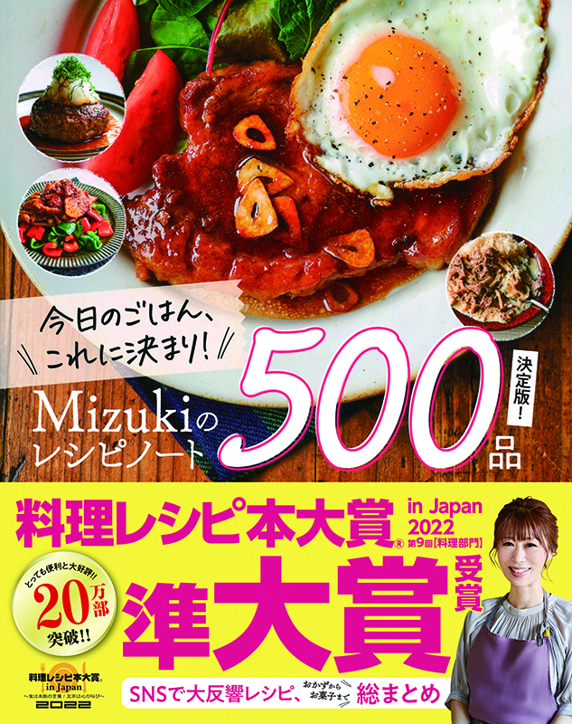 昨年9月に発売し、今年4月に累計発行部数20万部を突破した「今日のごはん、これに決まり!Mizukiのレシピノート決定版!500品」が、第9回料理レシピ本大賞in Japan2022の料理部門にて、準大賞を受賞いたしました。 選考委員を務める書店員のみなさまより、「コスパ最高の本」「ビジュアル的にも料理も本も造りが見事」など嬉しいコメントを多く頂きました。今後も編集部一丸となり役立つ本を製作して参ります。