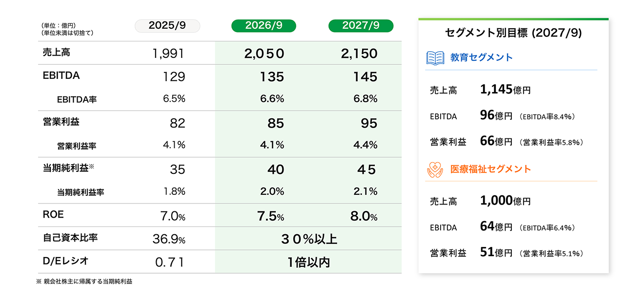 これにより、最終年度の2027年9月期には売上高2,150億円、EBITDA145億円、営業利益95億円、親会社株主に帰属する当期純利益45億円を目指します。