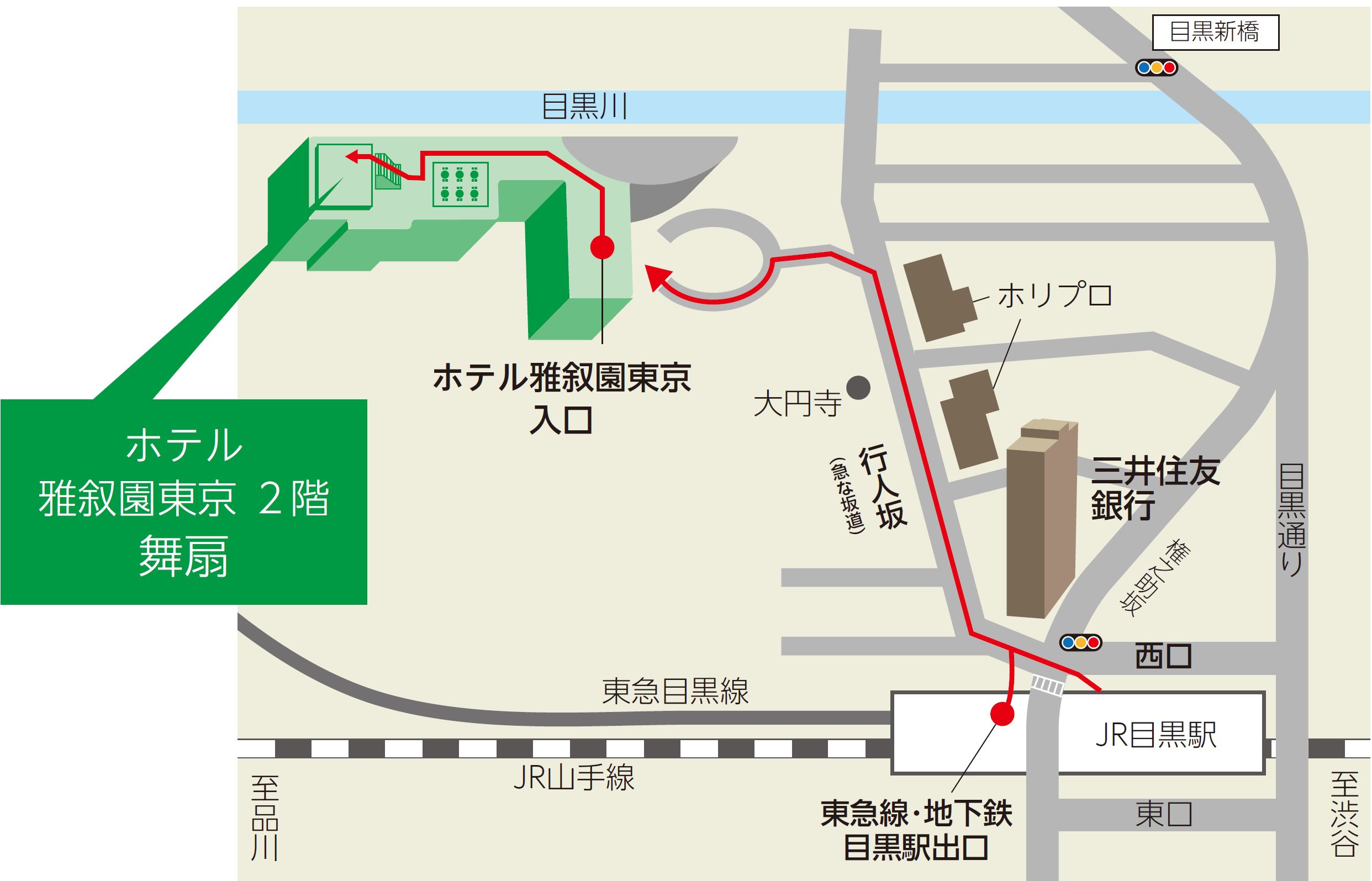 目黒駅(JR山手線西口、東急目黒線、地下鉄南北線・三田線)を出て、三井住友銀行の左側より行人坂を下ってください。ホテルに入ってから会場の「舞扇の間」まで5分程度かかります。