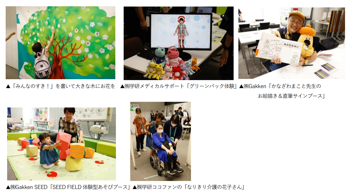 学研グループの㈱Gakken、㈱学研エデュケーショナル、㈱Gakken SEED、㈱学研メディカルサポート、メディカル・ケア・サービス㈱、㈱学研ココファン、㈱学研ココファン・ナーサリー、㈱学研ステイフル、㈱学研ホールディングスの計9社が、各社のコンテンツを活かしたブースを出展しました。参加された皆様には、医療、介護、幼児ワーク、幼児玩具などのさまざまな体験をしていただきました。