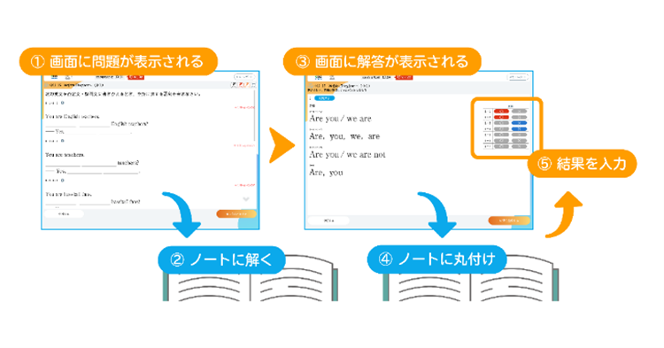 画面に表示される問題をノートに解き、画面に表示される解答を見てノートに丸つけをし、丸つけの結果を入力したら次の問題へ進むというのが基本の流れになります。学習結果を入力するため、取り組んだ時間や問題数は、学習履歴として閲覧できます。目標を設定できる機能もあり、モチベーションを保って取り組むことができます。
