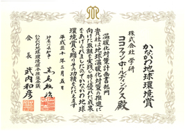 「かながわ地球環境賞」は、神奈川県とかながわ地球環境保全推進会議が、地球環境保全に向け「私たちの環境行動宣言 かながわエコ10(てん)トライ」の具体的取り組みに沿った実践的な活動や、神奈川県地球温暖化対策推進条例、神奈川県再生可能エネルギーの導入等の促進に関する条例に基づく優れた取組を行った団体や個人に対し、その功績をたたえ表彰するものです。