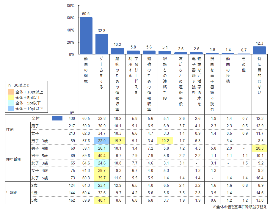 また、その目的を聞いたところ、「動画の閲覧」(60.5%)が最多であり、2位「ゲームをする」(32.8%)と比較しても約2倍の差をつけていることがわかりました。その一方で、「動画の閲覧」をする割合は3歳から5歳にかけて1.4ポイント減る程度であるのに対し、「ゲームをする」割合は3歳から5歳にかけて16.7ポイントと大きく増えることもわかりました。