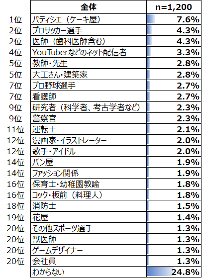 小学生が将来つきたいと考えている職業は、1位「パティシエ(ケーキ屋)」、2位「プロサッカー選手」・「医師(歯科医師含む)」、4位「You Tuber」などのネット配信者」となりました。「You Tuber」は男子のみのランキングでは1位の「プロサッカー選手」に続き2位となりましたが、一方で女子の1位は「パティシエ」で、「You Tuber」は19位であったことから、男子人気が高いことがわかります。