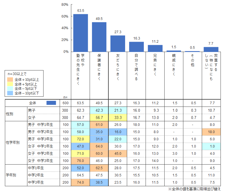 「勉強でわからないことがある場合、どうしているか?」と尋ねたところ、最も多いのは「学校や塾の先生にきく」(63.5%)、次いで「保護者にきく」(49.5%)、「友だちにきく」(27.3%)という結果となりました。一方、わからないことを「放置する(特になにもしない)」割合は少数ではあるものの、中学2年生男子は2割弱が該当し、同学年女子の4倍以上であることがわかりました。
