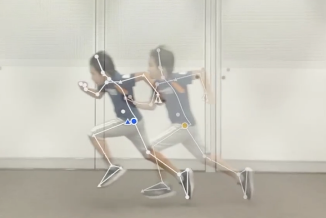 - 動画解析ツールの撮影の様子。プログラム参加前(オレンジ点)に比べて、参加後(ブルー点)にほうが膝の上り方が高くなっており、ストライドが向上していることがわかります。