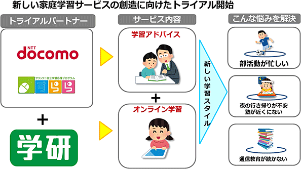 当社はICTを利用した新しい家庭学習サービスを創造するため、通信最大手のNTTドコモ社、eラーニングのすららネット社と共同で東京都内でサービス内容検証のためのトライアルを2015年5月より開始しました。