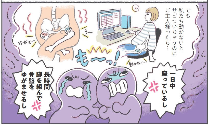 股関節をきちんと動かしていないと、お尻や裏ももなどの重要な筋肉が怠けてしまい、筋肉の状態がアンバランスに。すると、下半身にムダな脂肪がついたり、前ももばかりがムキムキに発達したりするなど、ボディラインの崩れを招いてしまいます。