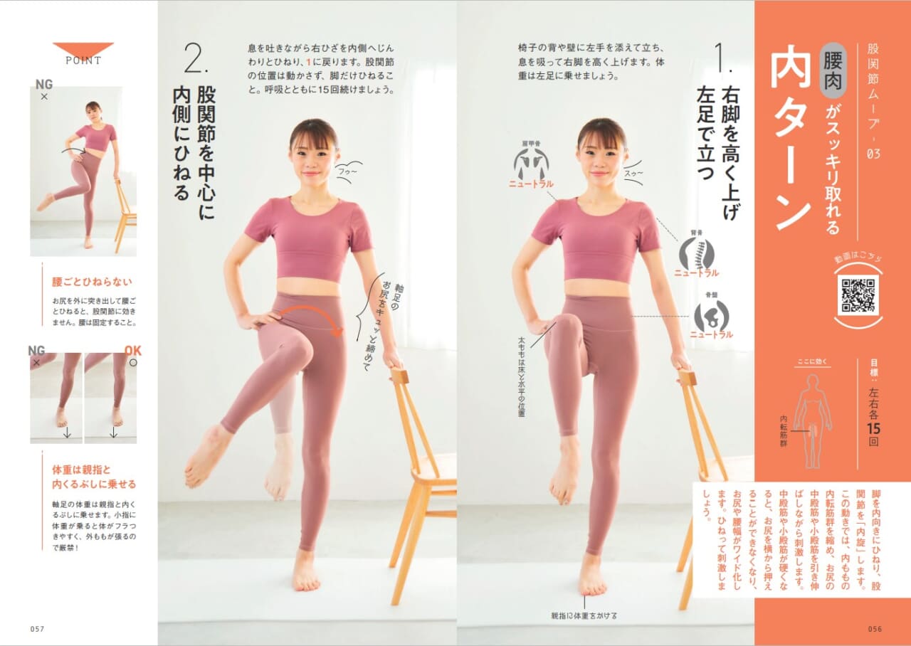 本書の「股関節ムーブ」は、立った状態で脚を動かす簡単な動きで、全方位から股関節を刺激するメソッド。お尻や脚まわりの筋肉の状態を整えながら、おなかの内側にある体幹を鍛える効果も。ゆがみを正して、美姿勢を維持しやすくなる、というメリットもあります。