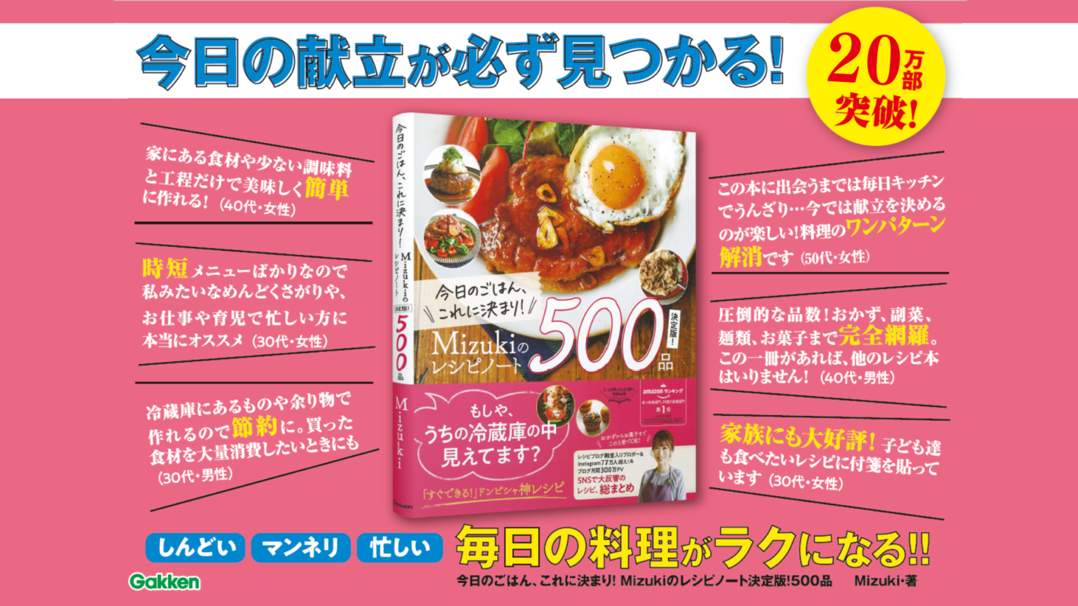 株式会社 学研ホールディングス(東京・品川/代表取締役社長:宮原博昭)のグループ会社、株式会社 学研プラス(東京・品川/代表取締役社長兼COO:南條達也)は、2021年9月24日発売の『今日のごはん、これに決まり!Mizukiのレシピノート決定版!500品』が2022年4月に累計20万部を突破したことを発表しました。