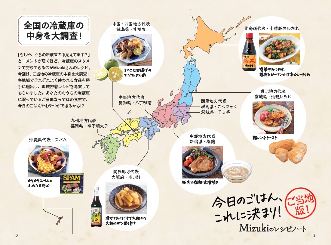 20万部突破を記念し、キャンペーン第一弾として、日本全国のご当地食材を使ったプチレシピ本を作成しました。北海道、東北、関東、中部、中国・四国、関西、九州、沖縄の各地方でよく使われる食品をピックアップ。ご当地ならではの食材を使った地域密着レシピをMizukiさんに考案していただきました。