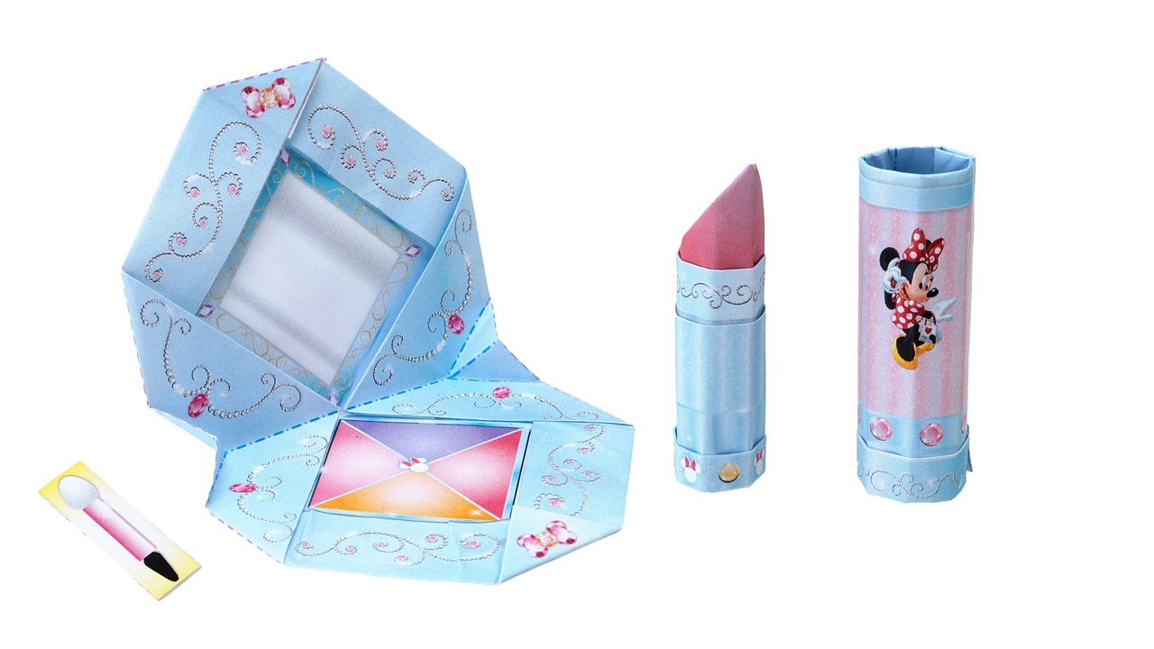 折り紙でつくる、コンパクトと口紅です。口紅は蓋つき♪ ミニーとデイジーといっしょにおけしょうごっこで遊ぼう!