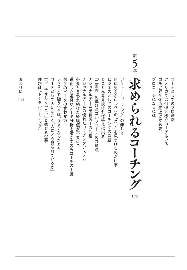本書は、目澤コーチのゴルフとの出会い、そしてコーチングとの出会いから、プロコーチになってからの選手たちとのエピソード、目澤流コーチングの概論、これからのコーチに必要なスキル・考え方などを本人が紐解いていく、いわゆる“レッスン書”ではなく“読むゴルフ、コーチングについての本”です。