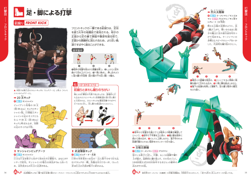 技をくり出す超人たちの能力や変身形態を解説する「超人のしくみ」や人気超人が過去に放った技の全データを集計・分析した「超人技分析データ」など、超人についてもっと知りたい“かつての良い子たち”の学ぶ意欲を刺激する内容満載です。
