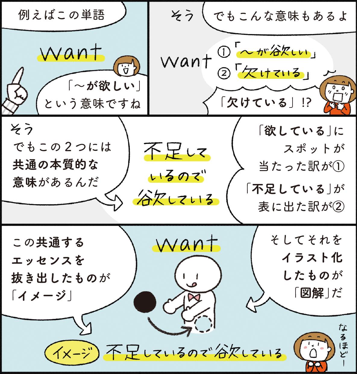 wantという単語を例にとると、wantには①「~が欲しい」②「欠けている」という大きく2つの意味が存在しています。本書では、wantという単語の基本イメージである「不足しているので欲している」という本質的な意味を図解化して説明します。