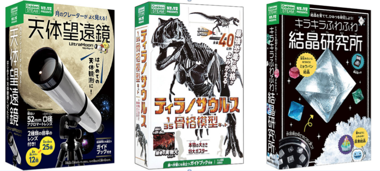 これまでたくさんの教材を作ってきた学研のノウハウが集結した『科学と学習PRESENT』シリーズから、大人気の3点をセレクト! 月のクレーターまで見える『天体望遠鏡ウルトラムーン』に、発売2週間で緊急増刷の『ティラノサウルス1/35骨格模型キット』、キラキラとキレイな結晶が育てられる 『キラキラふわふわ 結晶研究所』と、バラエティも豊かなセットです。お子さんの知的好奇心がぐんぐん伸びること間違いなし!