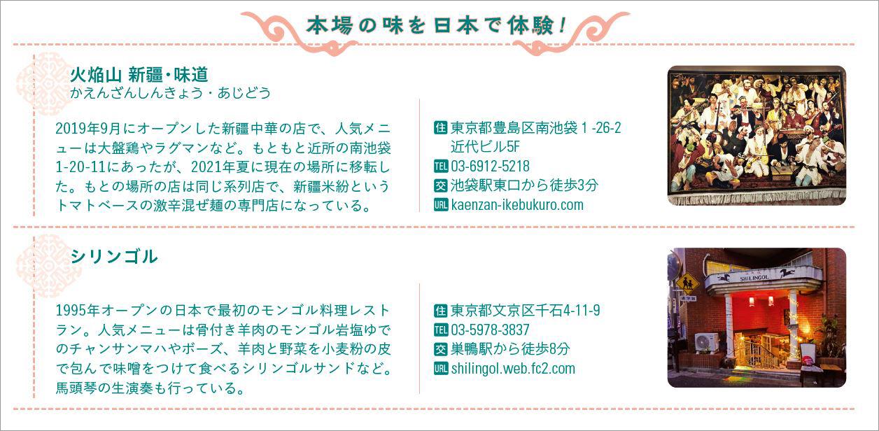 そして、中国から世界に伝わったアレンジ中華や、現地で生まれた各国オリジナル中華もご紹介。「中華丼や天津飯は日本で生まれた!?」「インドでおなじみのアメリカンチャプスイ」「韓国のジャージャー麺(チャジャンミョン)はカラメルが隠し味」など、個性豊かな中華が目白押し。日本で本場の味が楽しめるレストラン情報付きです。