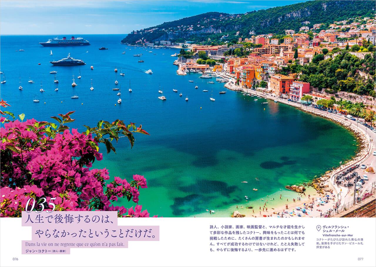 名言とともに紹介する100の写真は、ことばに関する場所や偉人ゆかりの場所もあれば、ことばのイメージにぴったりのスポットやモチーフまで実にさまざま。フランスやハワイで絶対に訪れてもらいたい観光名所はもちろん、編集者イチオシの知られざる絶景までを掲載しています。各ページには写真の場所紹介や解説もあるので、旅先選びの参考にもしていただけます。