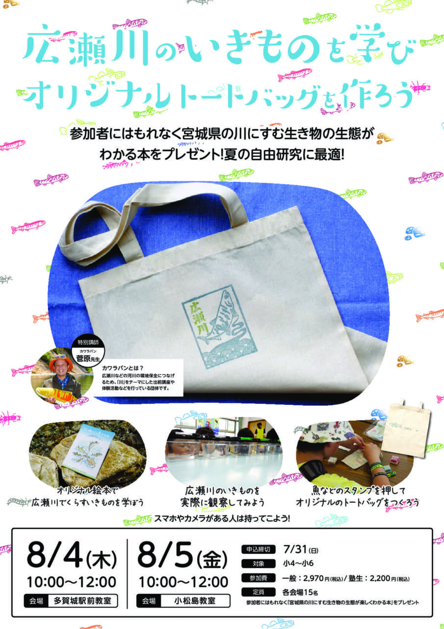 株式会社 学研ホールディングス(東京・品川/代表取締役社長:宮原博昭)のグループ会社、株式会社 学研スタディエ(さいたま市/代表取締役社長:亀谷眞宏)の展開する宮城県の総合進学塾あすなろ学院では、仙台市を中心に小学校や保育園において川の環境学習や体験活動の支援を行っている団体「カワラバン」とコラボレーションしたイベント開催する。