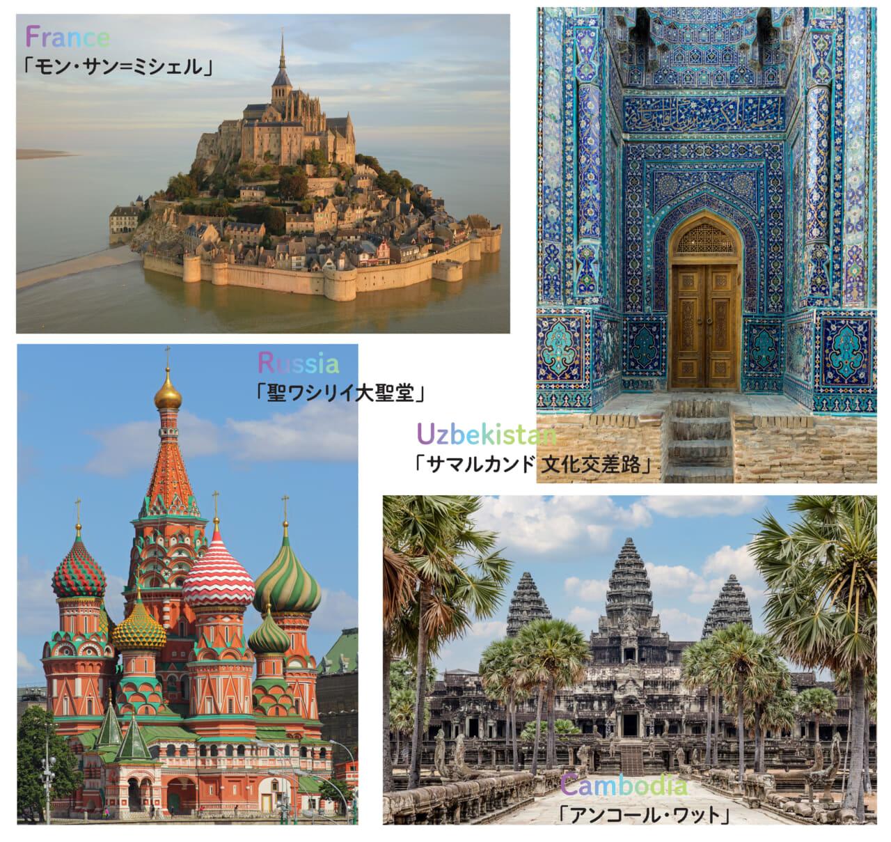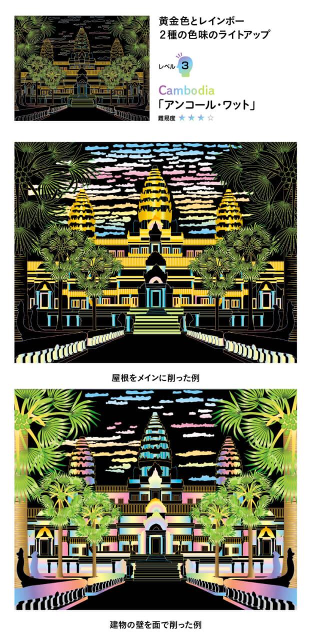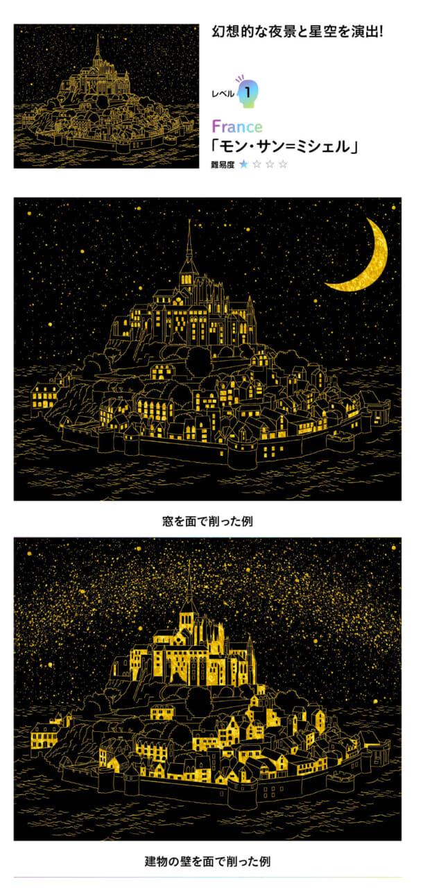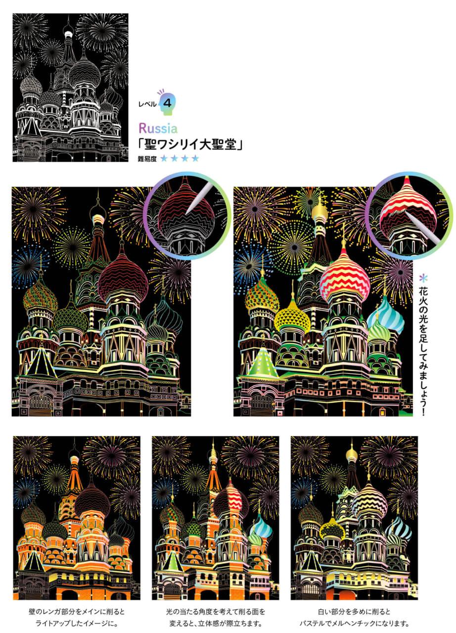 コロナ禍で世界を旅することが自由にならない今、少しでも旅の気分を味わえるように世界中の人気の世界遺産の中から「祈りの聖地」をテーマに、カラフルで、かつ癒しを感じられる場所を選びました。シートは難易度別に4枚あり、レベル1 フランス「モン・サン=ミシェル」、レベル2 ウズベキスタン「サマルカンド 文化交差路」、レベル3 カンボジア「アンコール・ワット」、レベル4 ロシア「聖ワシリイ大聖堂」です。削りながら描くことで、世界遺産への旅の気分を味わってもらえるよう願っています。