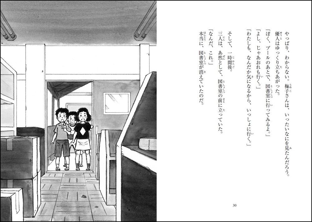 今作では、ものではなく「図書室」という場所が消えてしまいます。主人公の優人のひいおばあちゃん・梅子さんがある日、突然「学校の図書室がなくなった」といいだしますが、優人は数日前に本を借りに行っていたので、そんなはずはありません。優人がそのことをほかの子どもたちに言うと、さまざまな「消えた」証言が出てきて……。さらに、図書室に訪れると、そこはモヌケの殻。いったい図書室はどこに行ってしまったのでしょうか!? シリーズ最大のスケールで、4人の子どもたちが「消えた図書室」の謎にせまります。