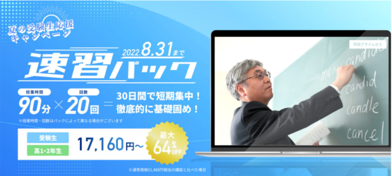 株式会社 学研ホールディングス(東京・品川/代表取締役社長:宮原博昭)のグループ会社、株式会社 学研プラス(東京・品川/代表取締役社長兼COO:南條達也)は、難関大向映像授業を配信している学研のプライム講座が行う「夏の受験生応援キャンペーン」の一環として、6月3日より学研プライムゼミ「夏の速習パック」28講座を、8月31日までのキャンペーン期間限定で発売いたします。「夏の速習パック」は、30日間の短期集中特訓で入試基礎力を完成させることを目的とした、オンラインの受験対策講座です。