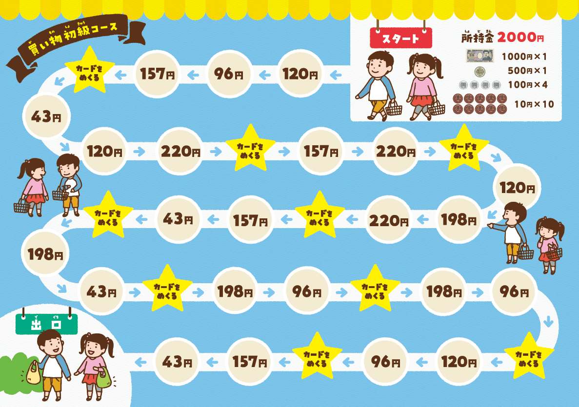 所持金2,000円でスタートします。身のまわりのものや欲しいものなど,身近な買い物でお金のやりとりを練習します。