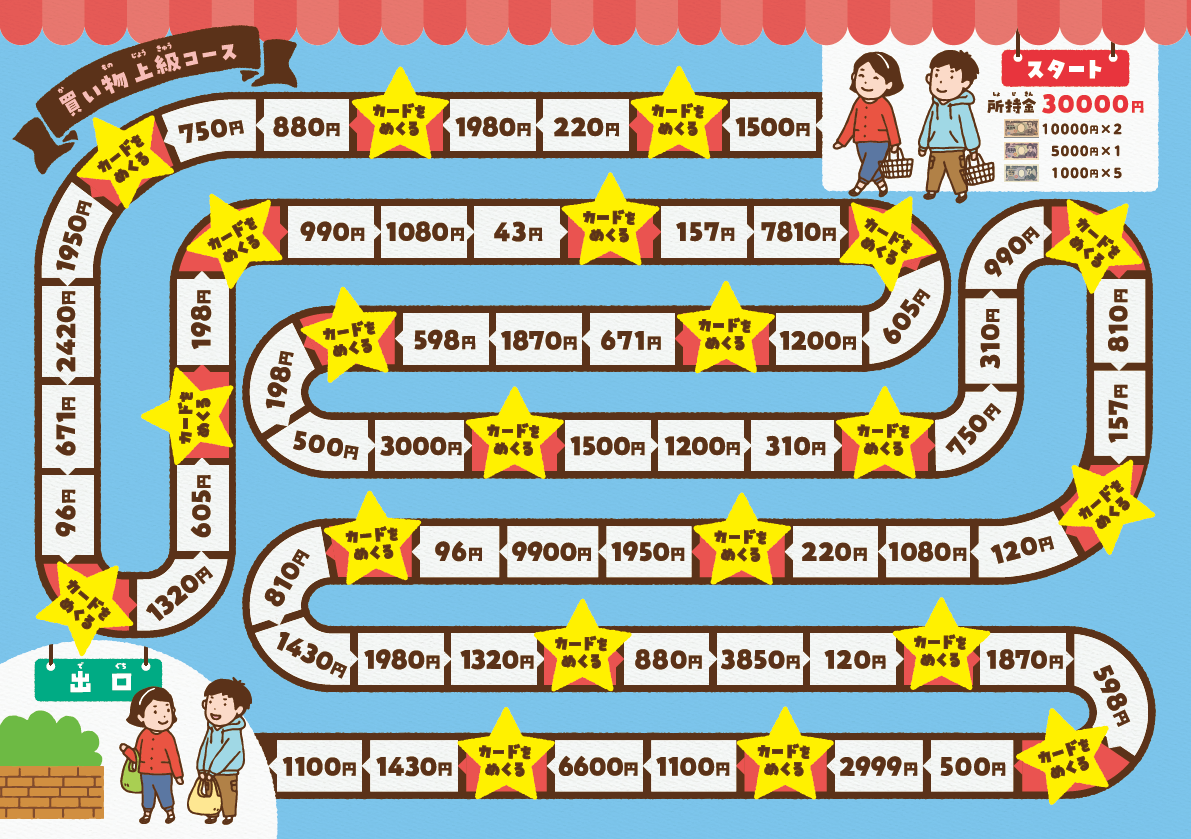 所持金30,000円でスタートします。生活の中のさまざまなものの値段を知り,生活を意識した幅広い買い物をします。