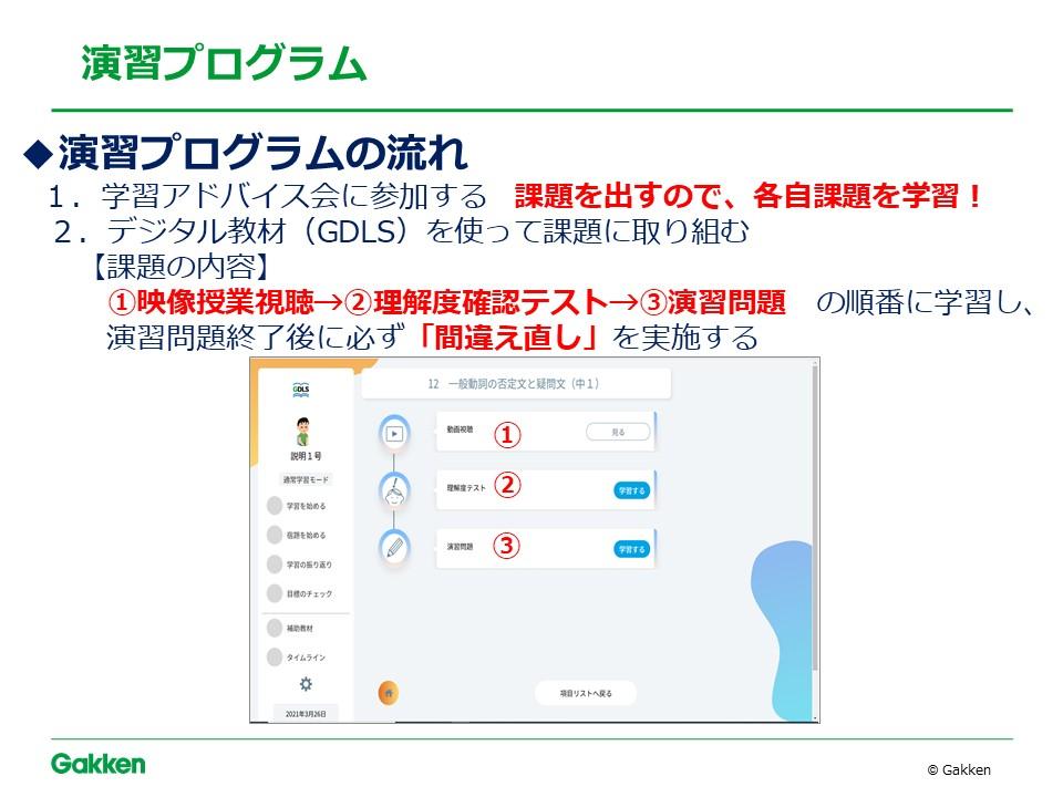 内容:学習アドバイス会で、勉強のしかたや課題を提示し、デジタル教材で演習をします。