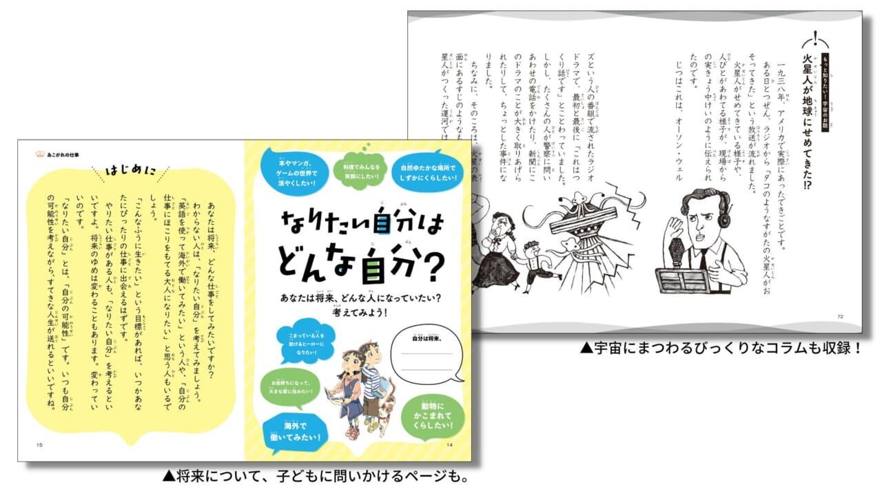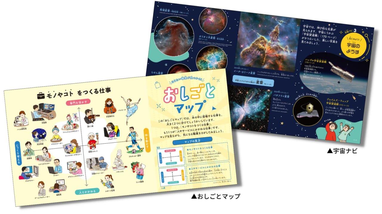 「しごとのお話」には、興味や関心をもとに、なりたい職業を探せる「おしごとマップ」つき。「宇宙のお話」には、太陽系の図解や、神秘的な宇宙の写真が載った「宇宙ナビ」つき。テーマをもっと深堀りできる、楽しい巻頭カラーページです。