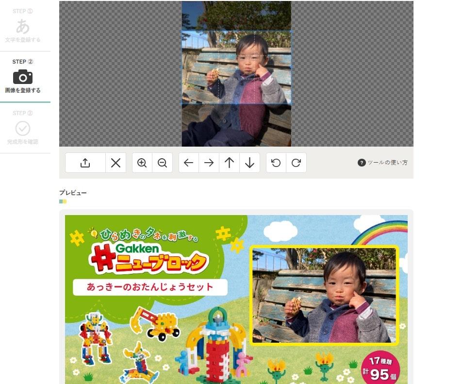 写真と名前が入ったラベルをつくって世界でひとつだけのニューブロックを贈るサービスです。
