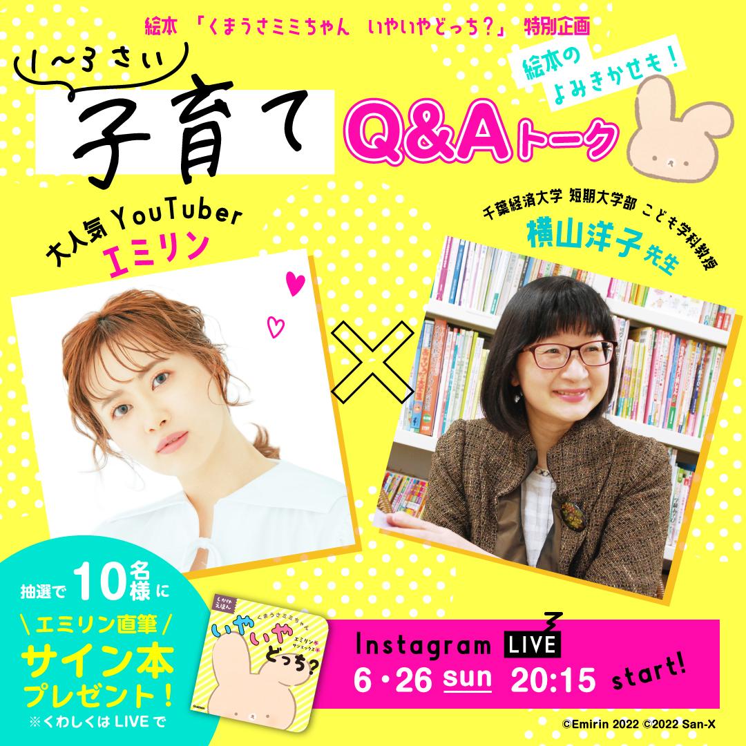 トークライブに登場するのは、『くまうさミミちゃん いやいやどっち?』の作者エミリンと、千葉経済大学 短期大学部 こども学科教授である、横山洋子先生。