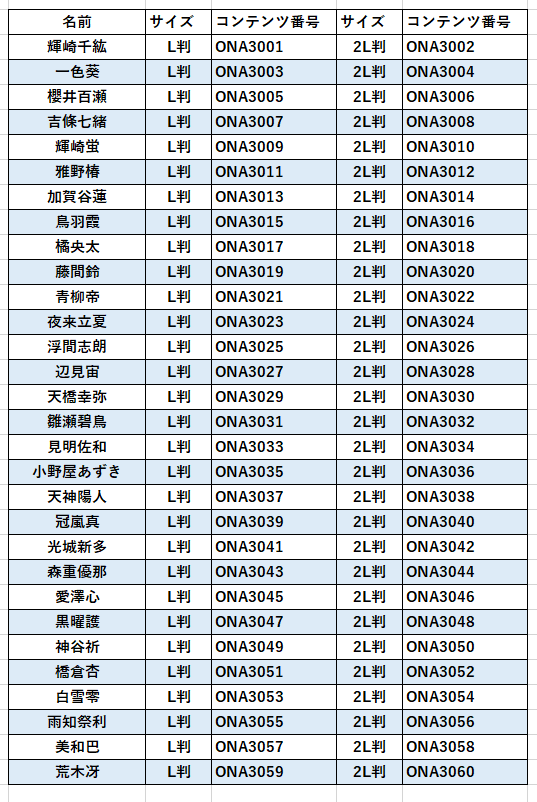 プリントサービスではゲーム内のイラストを使用した、各キャラクターのソロブロマイド30種類の絵柄から、ご希望の商品を選んでご購入いただけます。サイズはL判と2L判の2種類が選択可能です。