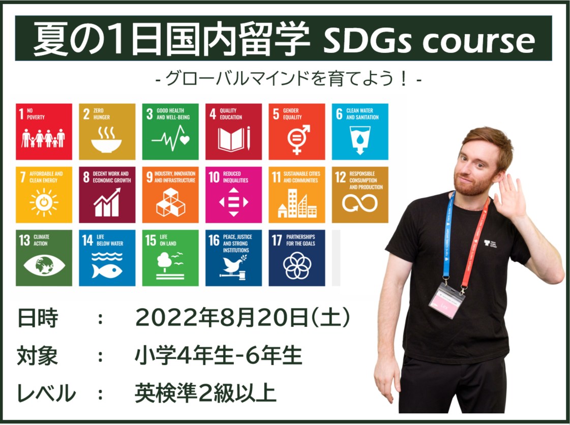 「夏の1日国内留学SDGs Course」では、近年さらに注目されているSDGsについて英語で考えます。5/3-5/5に開催された「Golden week 3day Academic course ~英語でSDGs!~」では、食べ物や資源について理解を深めましたが、今回は多文化理解やコミュニケーションに重きを置いた内容となっています。英語に自信のある方にオススメのプログラムです。※対象レベル:英検準2級合格以上