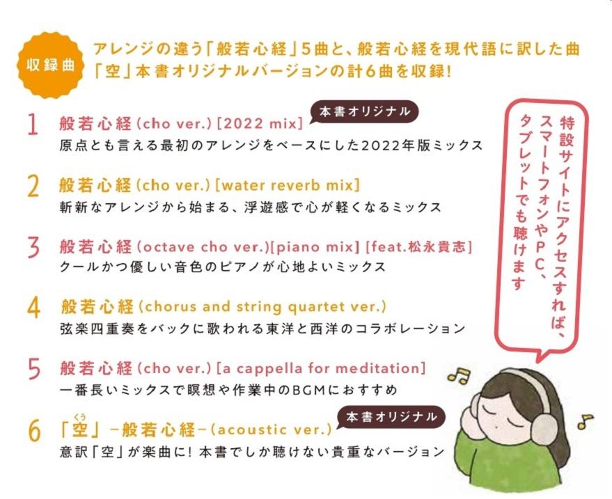 本書は、その薬師寺さんの歌う「般若心経」を、誰でもいつでも聴けるように、アレンジ違いの6曲を収録したCD付きの書籍となります(専用サイトにアクセスすれば、ダウンロード、ストリーミング再生も可能なので、スマートフォンやPC、タブレットでも聴くことができます)。6曲中の2曲は本書でしか聴くことのできないバージョンです。