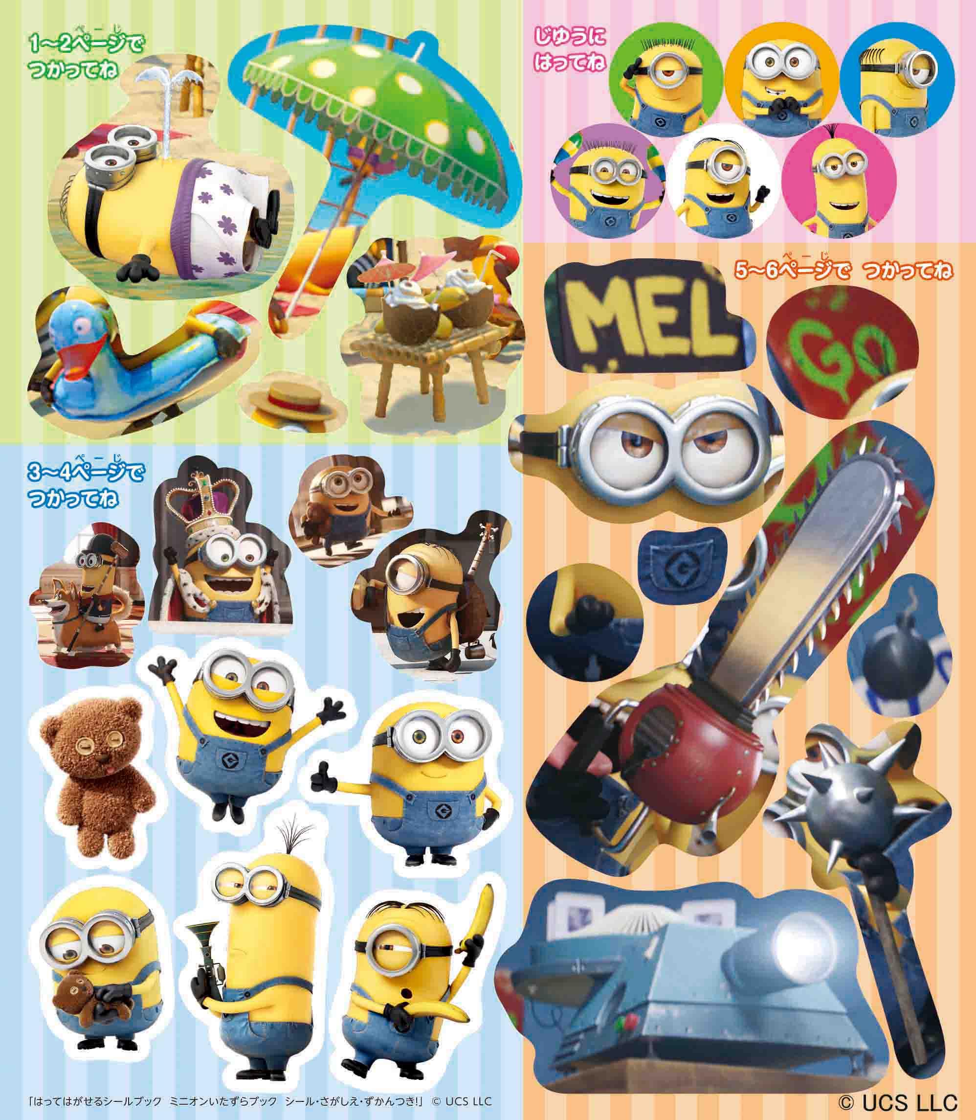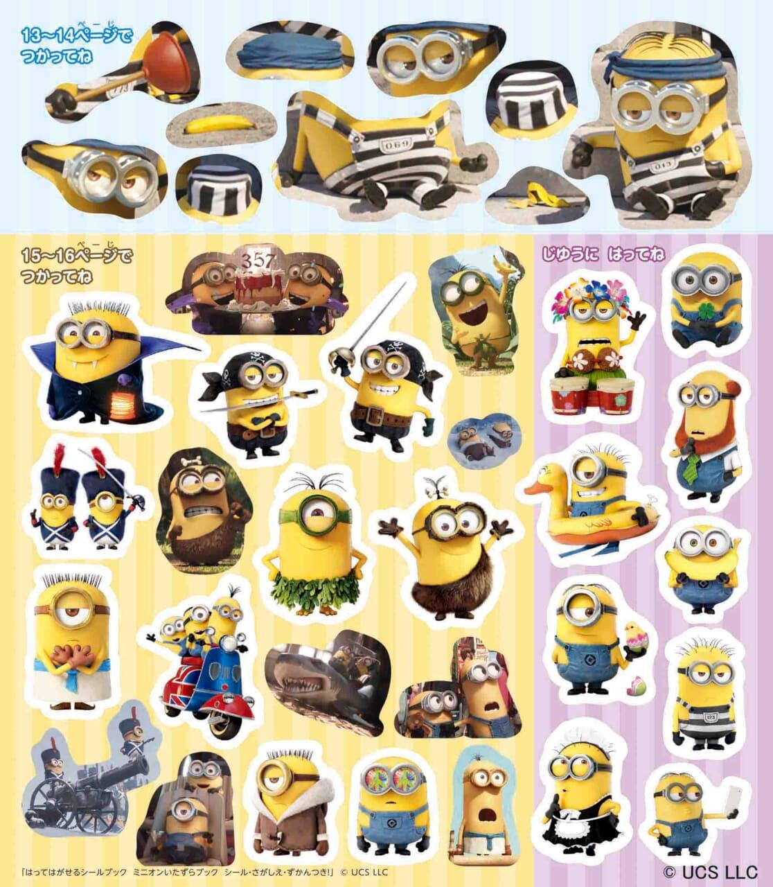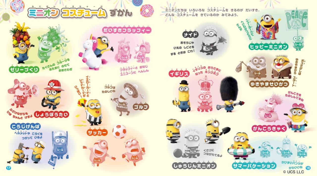 そのほかにも、ミニオンの歴史やミニオンコスチューム図鑑、行事を楽しむミニオンの紹介など、見て楽しいシールあそびのページがいっぱいです。