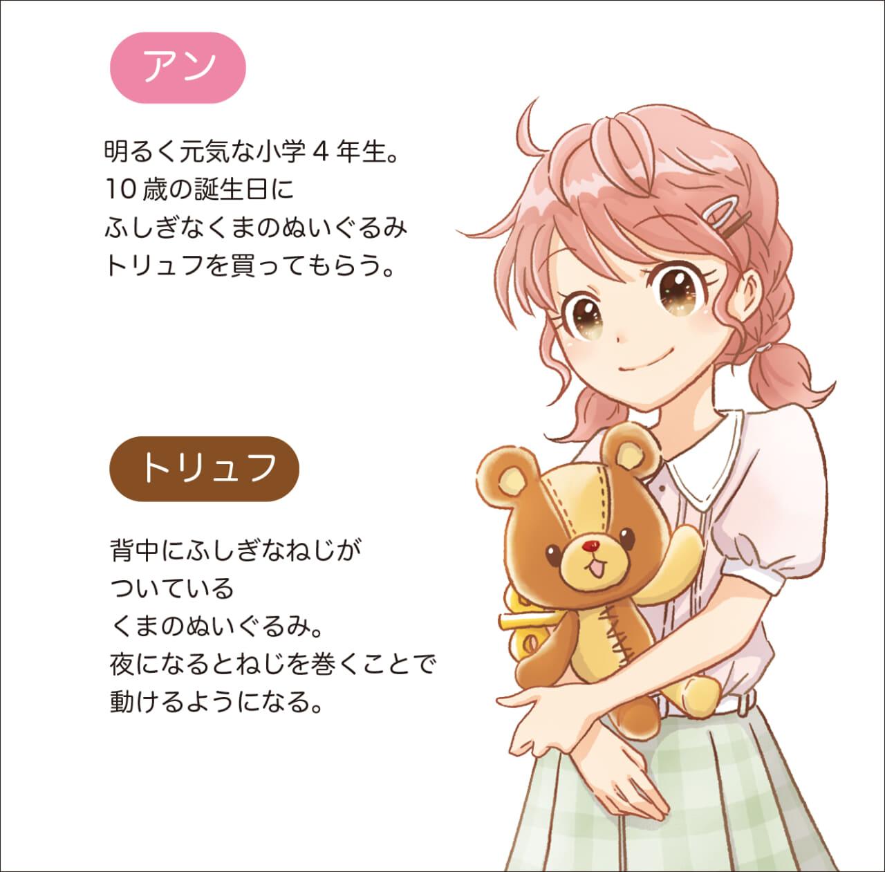 主人公のアンは明るく元気な女の子。10歳の誕生日に買ってもらった、背中に不思議なねじがついているくまのぬいぐるみ、トリュフは大切な友だちです。