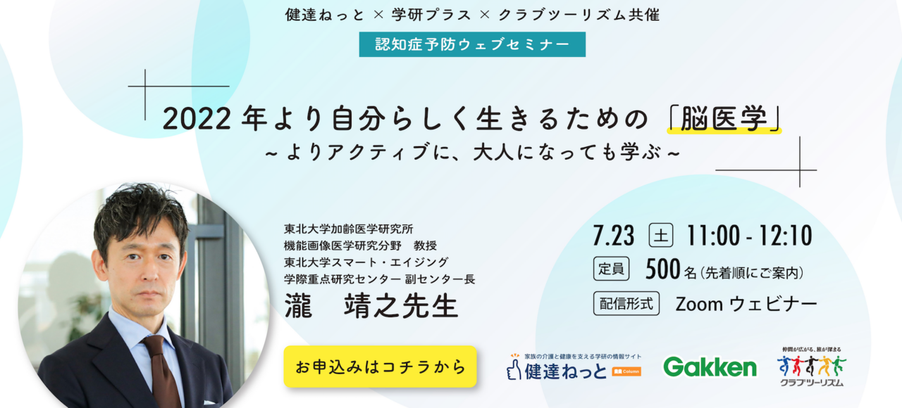 株式会社 学研ホールディングス(東京・品川/代表取締役社長:宮原博昭)のグループ会社、メディカル・ケア・サービス株式会社(埼玉・さいたま/代表取締役社長:山本教雄)は、株式会社 学研プラス(東京・品川/代表取締役社長:南條達也)、クラブツーリズム株式会社(東京・新宿/代表取締役社長:酒井博)と共催で2022年7月23日(土)に東北大学加齢医学研究所、東北大学スマート・エイジング学際重点研究センター教授 瀧靖之先生による、認知症予防に役立つウェブセミナーを開催いたします。