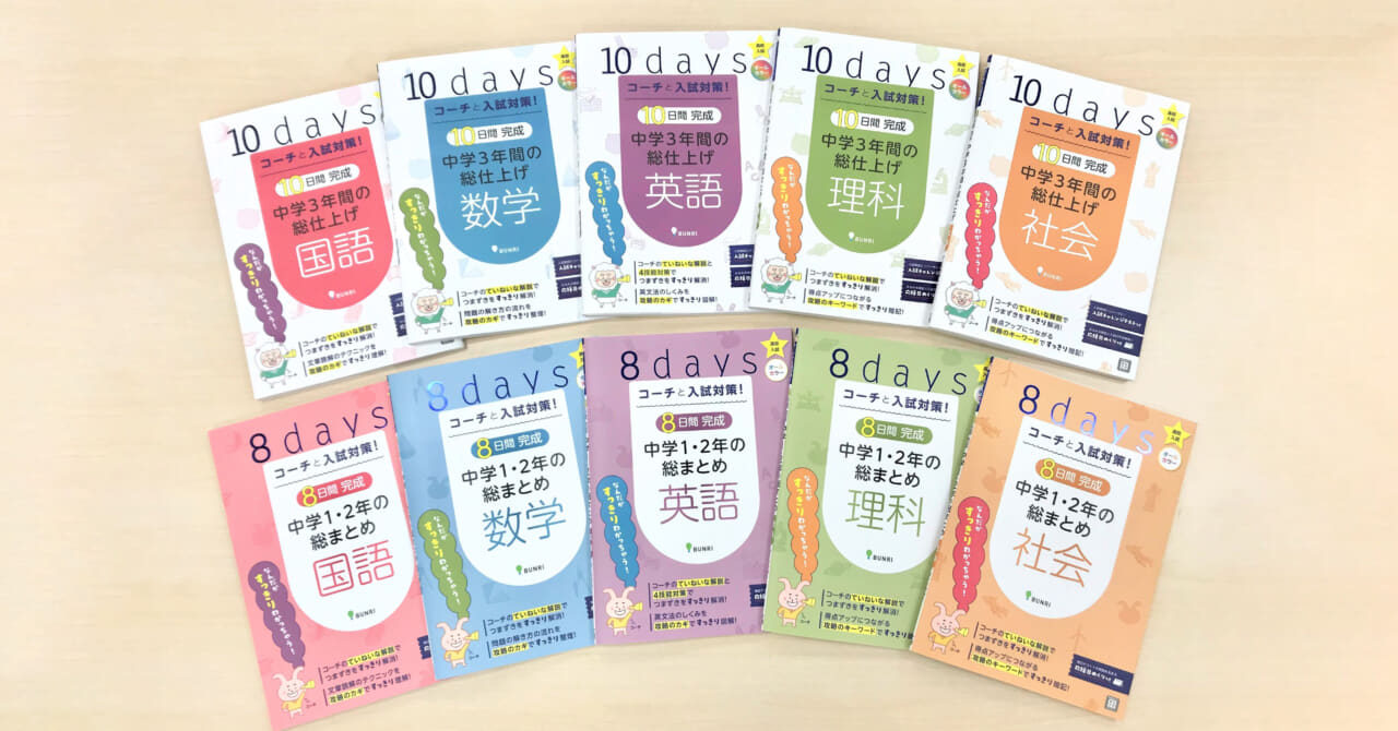 高校入試の基礎固めができる『8日間完成 中学1・2年の総まとめ』、入試の範囲全体をおさらいする『10日間完成 中学3年間の総仕上げ』の2種類を用意。