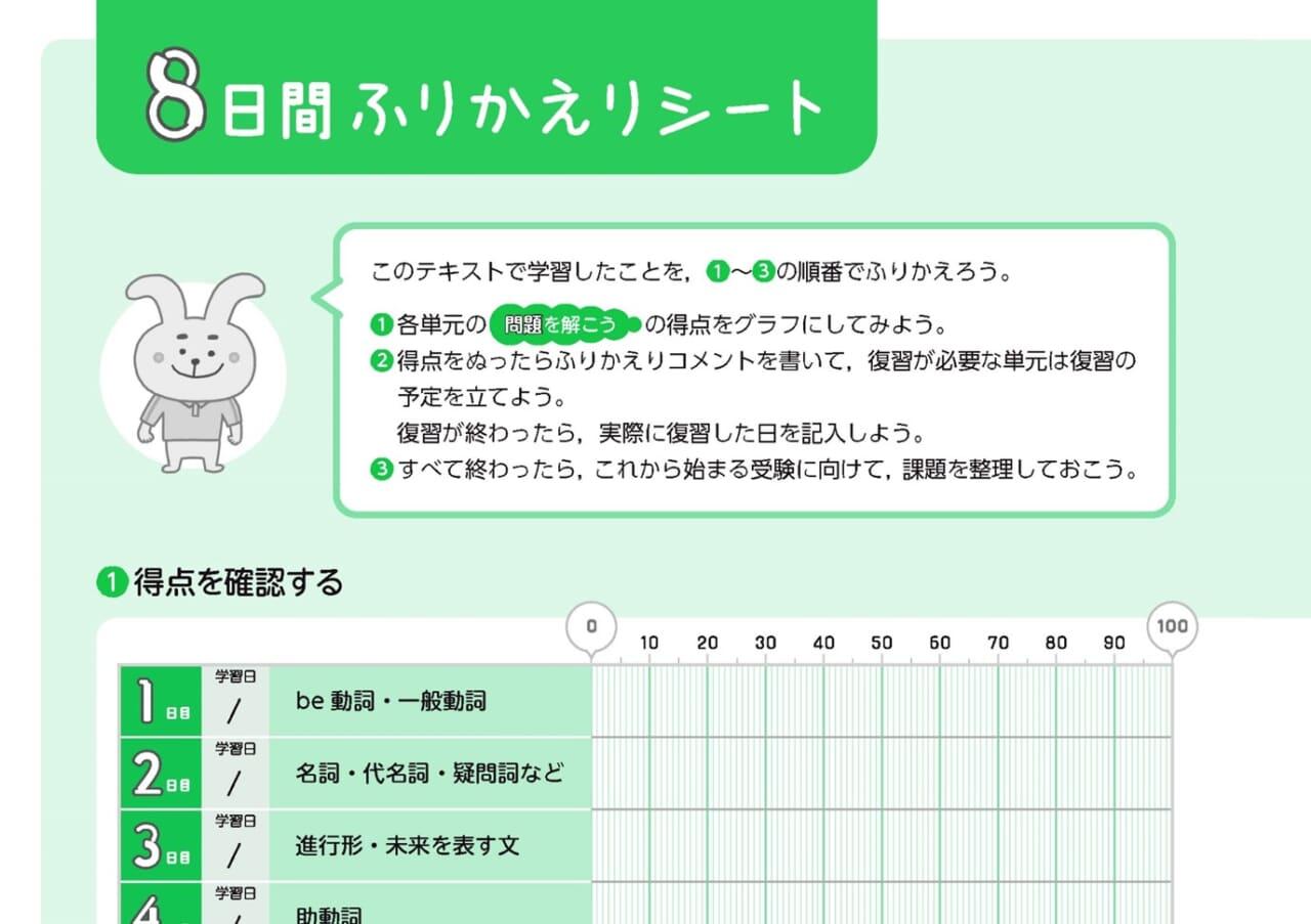 ふりかえりシートでは、各単元の点数を記録しておくことで、弱点を分析します。