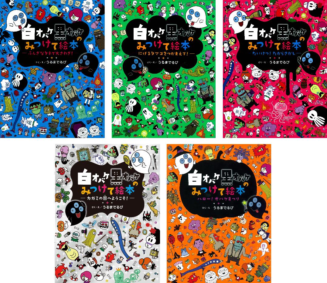 「白オバケ黒オバケのみつけて絵本」シリーズは、うるまでるび作・絵の、絵さがし・かくし絵・迷路などがつまった、遊べる絵本です。白オバケのシロッチと黒オバケのクロッチといっしょに、緻密に描かれたかわいいオバケの世界を楽しみましょう。