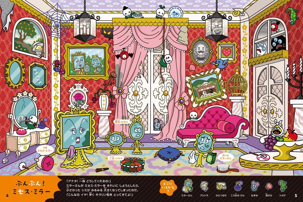 魔法の粉「キラリン粉」を求めて、いざ、かがみの国へ! 白オバケのシロッチと黒オバケのクロッチがオバケの仲間たちと向かったのは、鏡がいっぱいの不思議な世界。