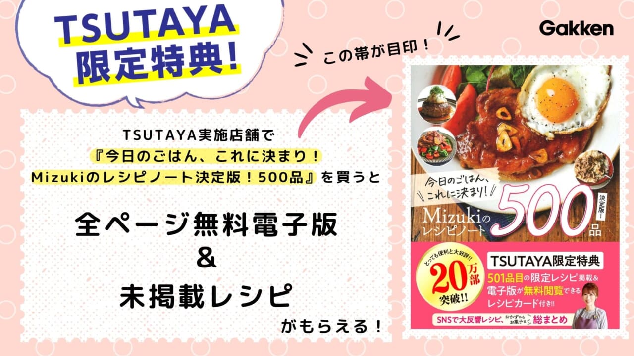 株式会社 学研ホールディングス(東京・品川/代表取締役社長:宮原博昭)のグループ会社、株式会社 学研プラス(東京・品川/代表取締役社長兼COO:南條達也)は、『今日のごはん、これに決まり!Mizukiのレシピノート決定版!500品』をTSUTAYA実施店舗で購入すると、電子版を無料で閲覧できる二次元コード付き特典レシピカードがもらえるキャンペーンを7月9日(土)頃から順次開催いたします。